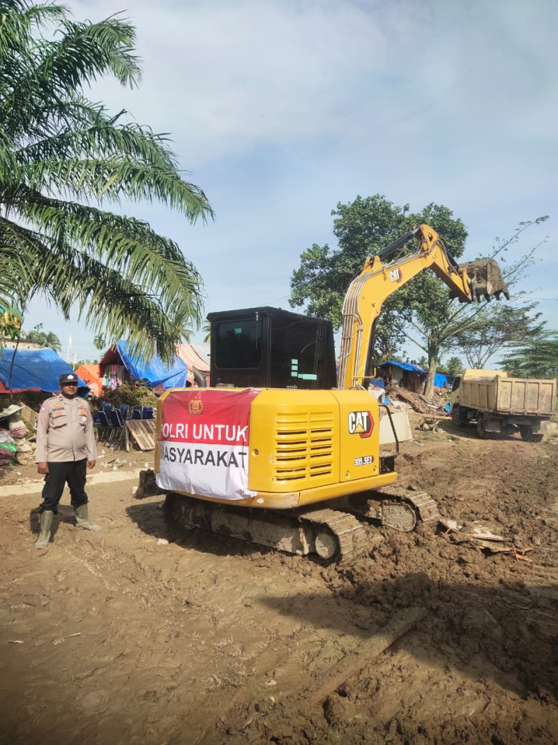 Sementara itu, di Sumatera Barat, Polri mengerahkan 12 unit alat berat dan 10 unit dump truck di Kabupaten Padang Pariaman, Agam, dan Pasaman Barat. Alat berat difokuskan untuk membuka kembali akses nagari dan korong, membersihkan pemukiman dan fasilitas layanan publik, serta memastikan jalur distribusi logistik masyarakat dapat kembali berjalan. Upaya ini dilakukan secara berkelanjutan seiring masih ditemukannya lumpur tebal dan material banjir di sejumlah titik.