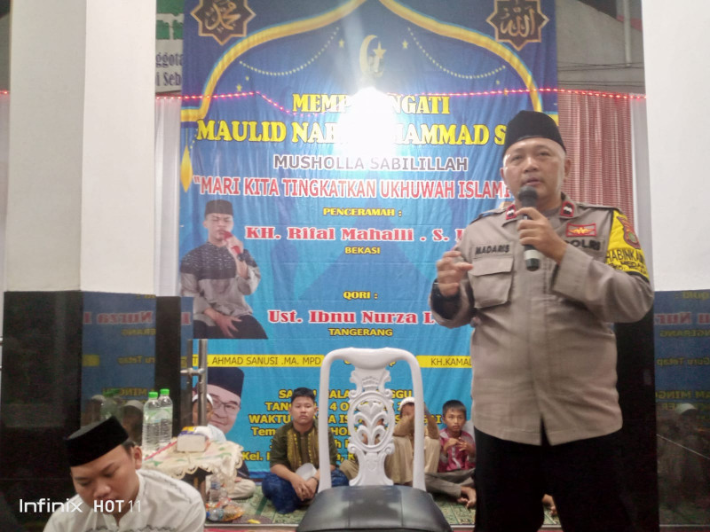 KOTA BEKASI, Media Budaya Indonesia. Com-Polsek Medansatria terus memperkuat kedekatan dengan masyarakat melalui partisipasi dalam kegiatan keagamaan. Bhabinkamtibmas Kelurahan Medansatria, Aipda Madaris, menghadiri peringatan Maulid Nabi Muhammad SAW di wilayah hukumnya.