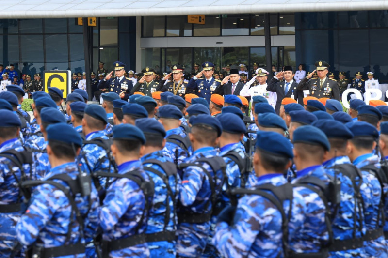 Makassar, Media Budaya Indonesia. Com - Komandan Lanud Sultan Hasanuddin Marsekal Pertama TNI Arifaini Nur Dwiyanto, M.Han didampingi Ketua PIA AG Cab.7/D.II Lanud Sultan Hasanuddin Ny. Betty Arifaini Nur Dwiyanto, menghadiri Upacara Peringatan HUT Ke-80 Tentara Nasional Indonesia di Apron Base Ops Lanud Sultan Hasanuddin, Makassar, Minggu (5/10/2025).
