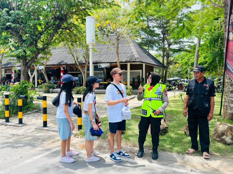 Dalam sebuah momen, terlihat Polwan menyapa dan memberikan informasi kepada wisatawan asing di kawasan wisata di Kuta Mandalika, Lombok Tengah.