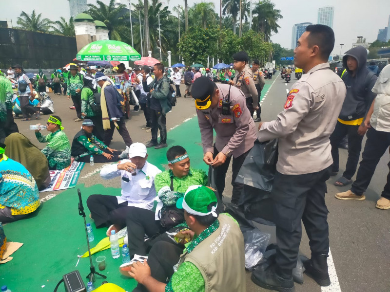 Pelayanan Humanis Polisi di Aksi Guru Madrasah, Bagikan Roti hingga Air Mineral