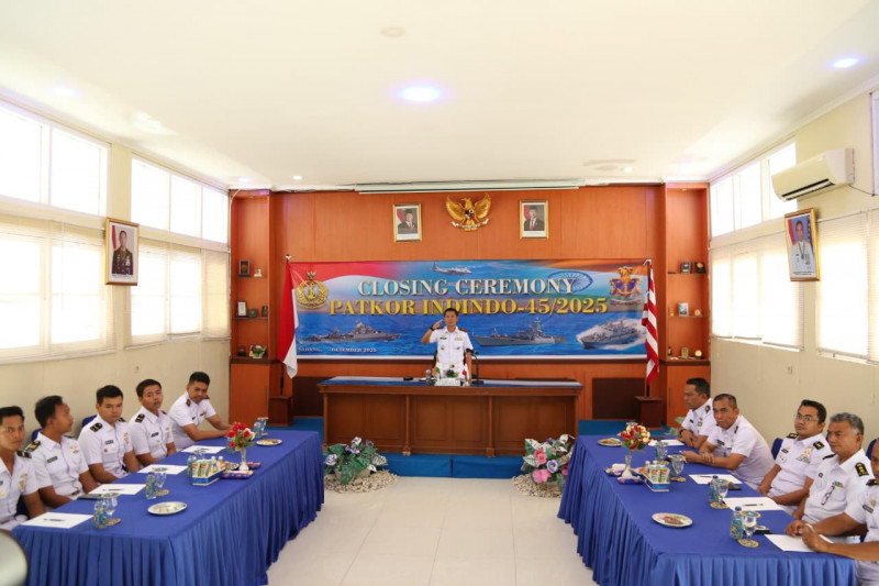 TNI AL, Sabang, Media Budaya Indonesia. Com -Komandan Pangkalan TNI AL (Danlanal) Sabang Kolonel Laut (P) Sadimin, S.E., M.Tr.Opsla., selaku Dansatgas Patkor Indindo-45/2025 gelar kegiatan Closing Ceremony Patkor Indindo 45/2025 secara virtual yang didampingi Pejabat Utama serta Perwira TNI AL yang berada di wilayah Kota Sabang bersama Indian Navy yang berada di India. Kegiatan tersebut digelar di Aula Teuku Umar Mako Lanal Sabang, Jalan Yos Sudarso, Kuta Ateuh, Kecamatan Sukakarya, Kota Sabang, Selasa (16/12/2025).