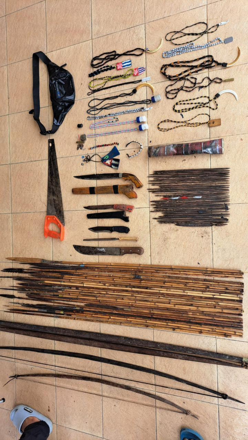 Dari penggerebekan di enam lokasi, aparat mengamankan barang bukti berupa parang, tombak, panah, bendera berlambang tertentu, serta telepon genggam. Senjata api belum ditemukan.