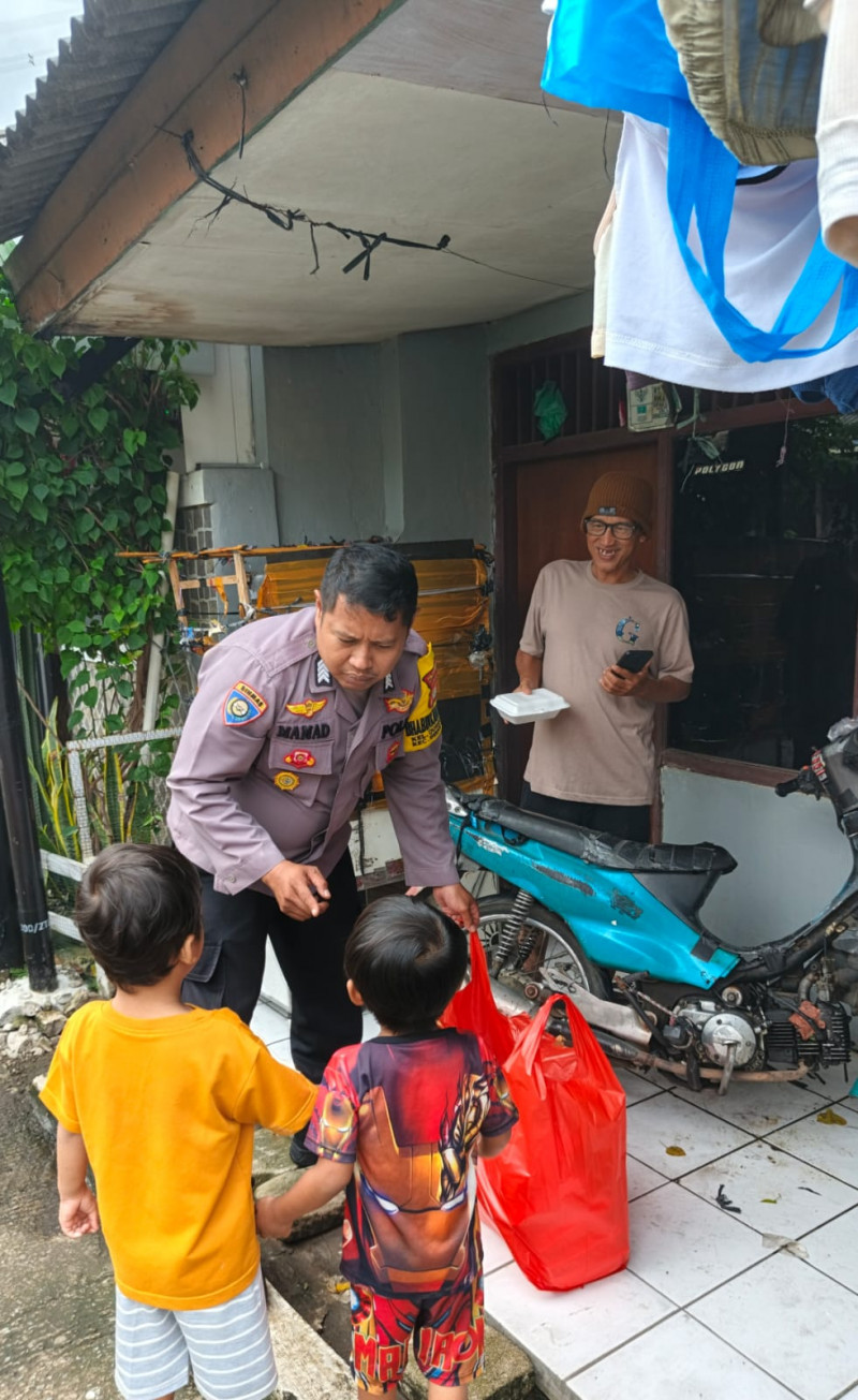 Bhabinkamtibmas Kelurahan Duren Jaya Bripka Mamad melaksanakan kegiatan pembagian nasi kepada warga yang terdampak banjir di Jl. Prof. Moh. Yamin RT 05 RW 003, Kelurahan Duren Jaya, Kecamatan Bekasi Timur, Kota Bekasi.