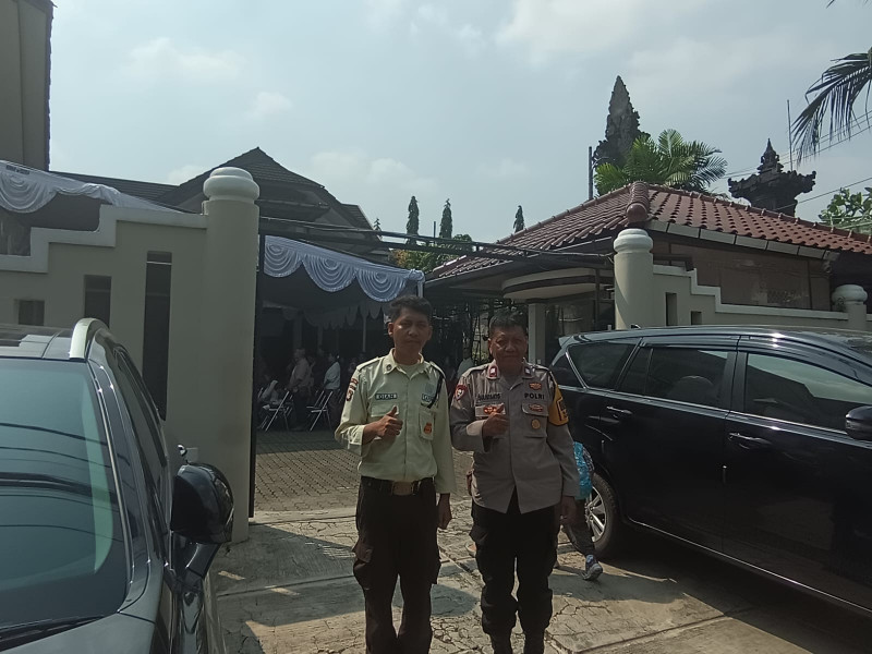 Bhabinkamtibmas Aiptu Sulistanto hadir langsung di lokasi, bergabung dengan petugas keamanan gereja, Bapak Dian, untuk memantau situasi.