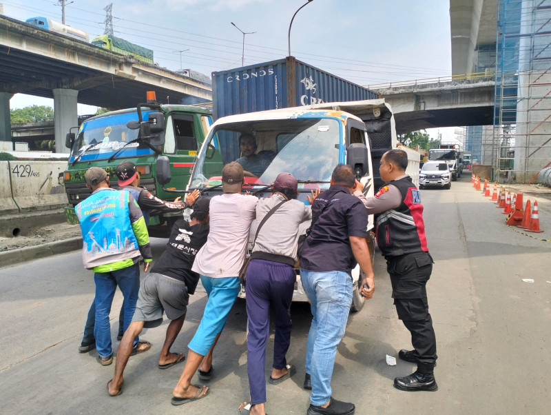 Polisi Pademangan dan Warga Bersama-sama Dorong Truk Mogok di Depan Stasiun Ancol, Lalu Lintas Kembali Lancar