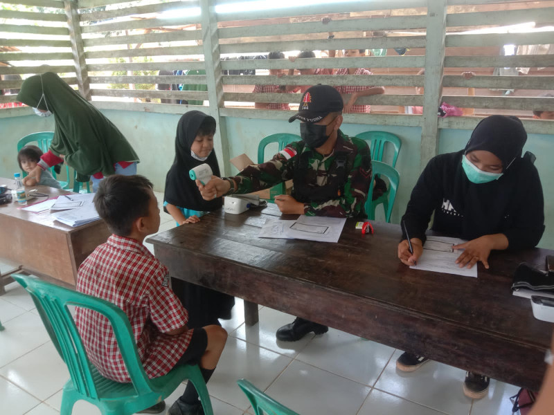 Muakan Petinggi, Kalbar l Budaya Indonesia - Anggota Satgas Pamtas RI-Malaysia Yonif 144/JY gelar Vaksinasi Anak SDN 08 bersama Nakes Puskesmas di desa Muakan Petinggi Kecamatan Ketungau Hulu Kabupaten Sintang Kalbar.