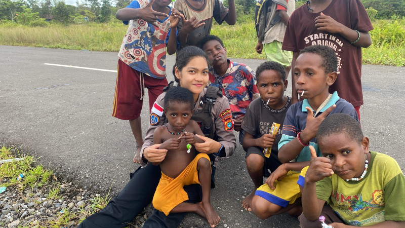 Polwan Satgas Ops Damai Cartenz Berikan Sentuhan Humanis Bersama Anak-Anak Nduga