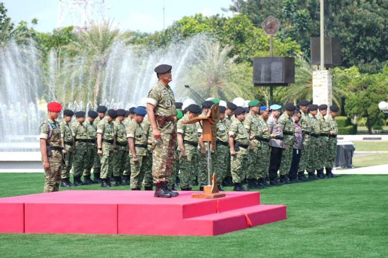 Jakarta, Panglima TNI Jenderal TNI Agus Subiyanto yang diwakili oleh Wakil Panglima TNI Jenderal TNI Tandyo Budi Revita melepas 180 prajurit TNI yang tergabung dalam Satuan Tugas (Satgas) Kompi Zeni (Kizi) TNI Kontingen Garuda (Konga) XXXVII-L United Nations Multi-Dimensional Intergrated Stabilization Mission in Central in Africa (Minusca Car) TA. 2025 yang dipimpin oleh Danyon Zipur 4/Tanpa Kawandya Letkol Czi Septian Hermawan Saputra, sebagai Dansatgas bertempat di Lapangan Prima, Mabes TNI Cilangkap Jakarta Timur, Selasa (14/10/2025).