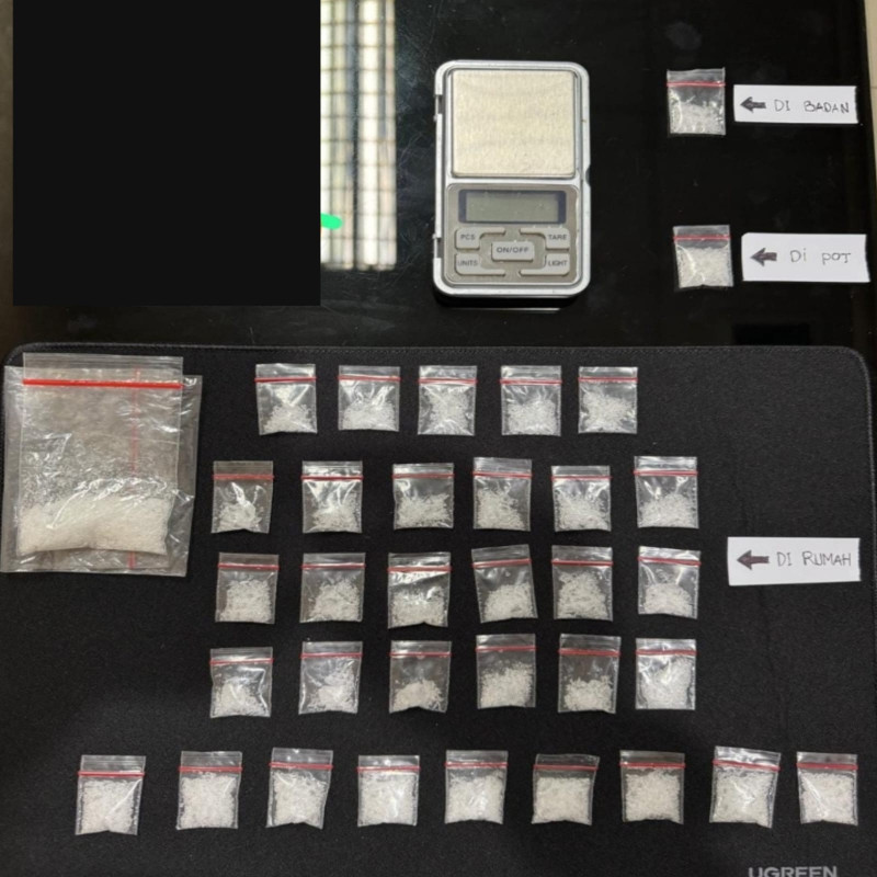 Dari penangkapan tersebut , polisi mengamankan barang bukti berupa 28,1 gram sabu yang terbagi dalam 35 bungkus plastik klip. Sabu tersebut ditemukan di dua lokasi; 0,5 gram di kantong celana IBN, 0,9 gram di dekat pot tanaman sekitar 5 meter dari lokasi penangkapan, dan sisanya, 27,6 gram, ditemukan di rumah IBN di Kampung Rawa Bugel, Kelurahan Harapan Jaya. Selain sabu, polisi juga menyita satu unit handphone merk OPPO Reno 2F dan sebuah timbangan digital.