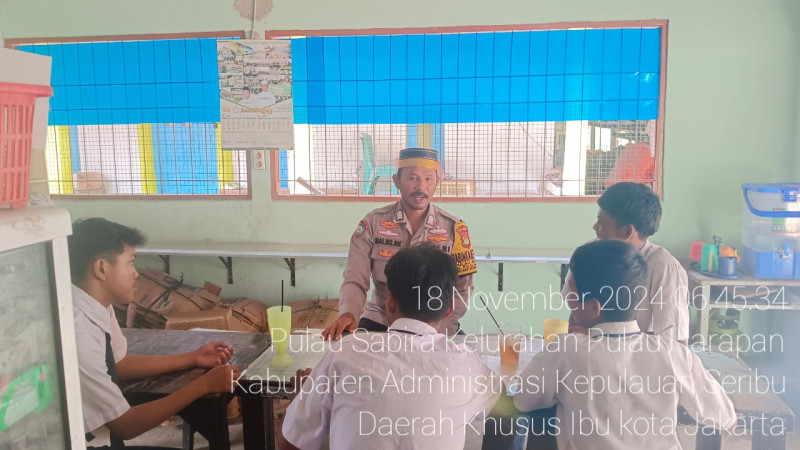 Jakarta, Media Budaya Indonesia.Com - Bhabinkamtibmas Pulau Sabira, Polres Kepulauan Seribu, Bripka Amirulloh Maliki, S.H., melaksanakan kegiatan sambang ke sekolah-sekolah di Pulau Sabira pada Senin (18/11/2024). Kegiatan ini dilakukan untuk memberikan penyuluhan dan imbauan kepada para pelajar agar menjauhi tawuran serta kenakalan remaja yang dapat merusak masa depan.