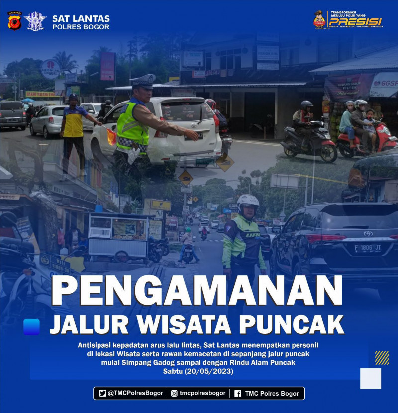 Polres Bogor I Media Budaya Indonesia.Com - Satuan Lalu Lintas Polres Bogor Polda Jabar menyiagakan sejumlah personel di Lokasi Wisata dan Lokasi Rawan Kemacetan di Jalur Wisata Puncak untuk mengantisipasi terjadinya kepadatan arus lalu lintas, Sabtu (20/05/2023).