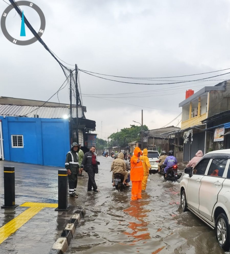 Petugas juga melakukan pemantauan kondisi jalan yang terdampak genangan air dengan ketinggian sekitar 15 sentimeter. Meski demikian, arus lalu lintas masih dapat dilalui oleh kendaraan roda dua maupun roda empat.