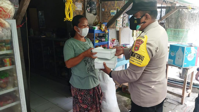 Melalui Personel Polsek jajarannya nasi kotak dibagikan ke warga kaum dhuafa secara door to door agar tidak terjadi keeumunan.