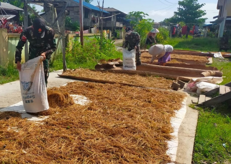 Anggota Satgas Yonif 144/JY Bantu Warga Menjemur Padi di Perbatasan