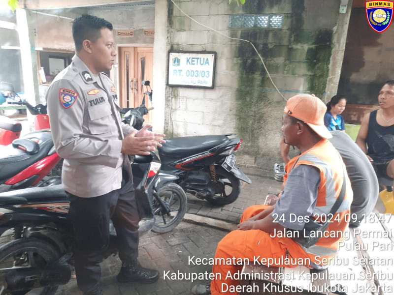 Jakarta, Media Budaya Indonesia.Com – Dalam rangka menciptakan situasi yang aman dan nyaman selama perayaan Natal dan Tahun Baru (Nataru), Bhabinkamtibmas Pulau Lancang, Polres Kepulauan Seribu, Briptu Tulus Hidayat melaksanakan sambang ke warga, Rabu (25/12/2024). Kegiatan ini bertujuan untuk meningkatkan kesadaran masyarakat terhadap pentingnya menjaga keamanan lingkungan, terutama menyambut wisatawan yang berkunjung ke Pulau Lancang.