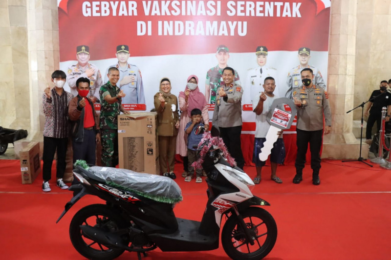 Tidak hanya sampai disitu, Brigjen Pol Drs. Bariza Sulfi mengundi sekaligus memberikan doorprize hadiah satu unit sepeda motor roda dua kepada masyarakat Kabupaten Indramayu yang telah melaksanakan gebyar vaksinasi serentak.