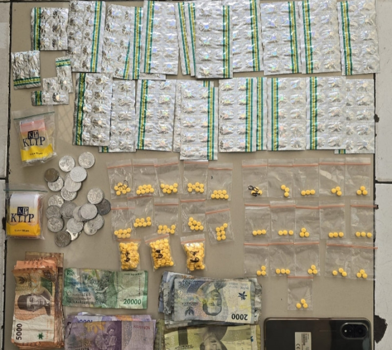Dalam penggerebekan ini Polisi berhasil mengamankan pelaku berinisial AM (27) berikut barang bukti 225 butir Tramadol, 310 butir Exsimer siap jual serta handphone digunakan untuk bertransaksi dan uang hasil penjualan.