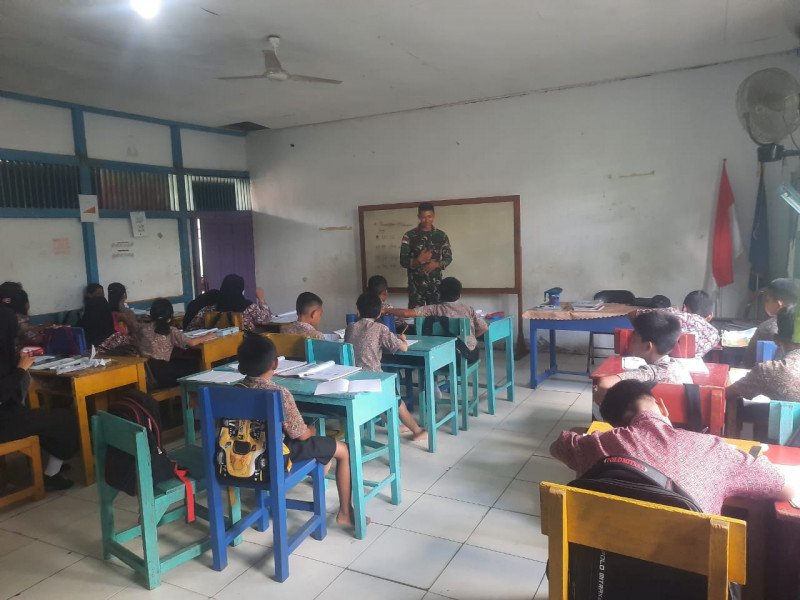Entikong, Kalbar l Media Budaya Indonesia – Personil Pos Kotis Gabma Entikong Satgas Pamtas RI-Malaysia Yonif 645/Gty dipimpin Serda Sakti Ratanca beserta 1 Anggota, bantu mengajar atau menjadi tenaga pendidik (Gadik) di SDN 03 Sontas Dsn. Sontas, Desa Entikong, Kec. Entikong Kab. Sanggau Prov. Kalbar. Kamis, (28/07/2022).