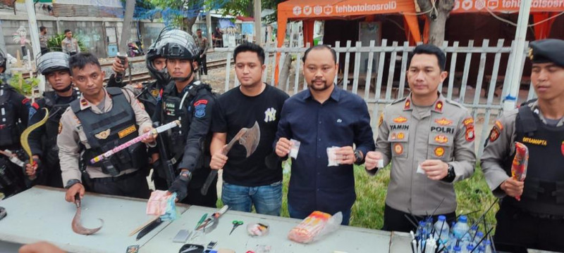 Adapun barang bukti yang diamankan terdiri dari 5 orang pelaku terduga bandar narkoba, 2 unit timbangan digital, 5 unit Hp, Cangklong, Bong dan sedotan serta 17 pcs Korek, Plastik Klip berbagai ukuran, 2 senjata tajam jenis badik,1 Senjata tajam kapak, 2 senjata tajam jenis samurai dan pedang, 5 senjata tajam jenis celurit serta uang tunai pecahan 100.000 dan pecahan 50.000 ( belum terhitung jumlahnya).